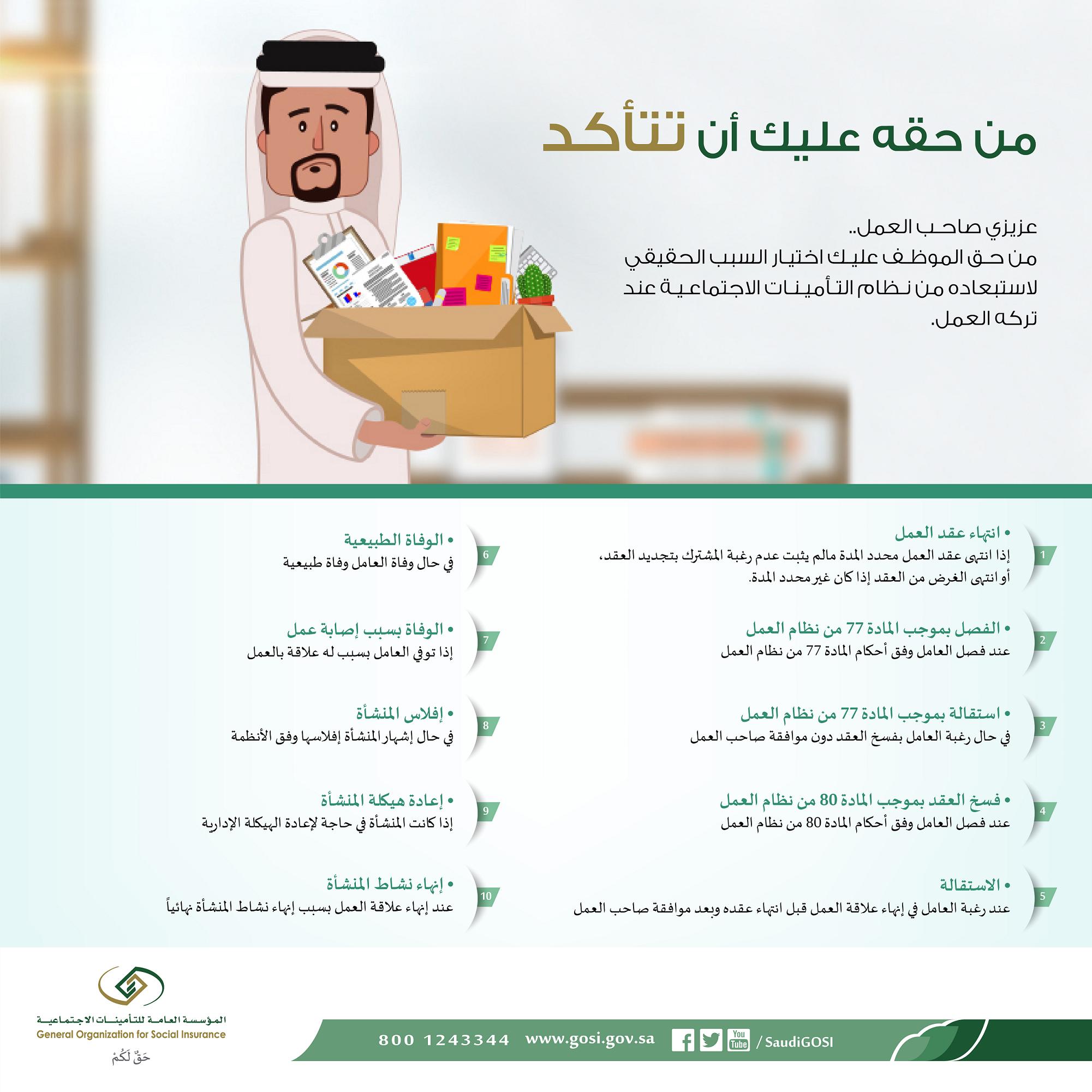 من حق الموظف على صاحب العمل اختيار السبب لإستبعاده من نظام التأمينات عند تركه للعمل صحيفة اشراقة رؤية الالكترونية