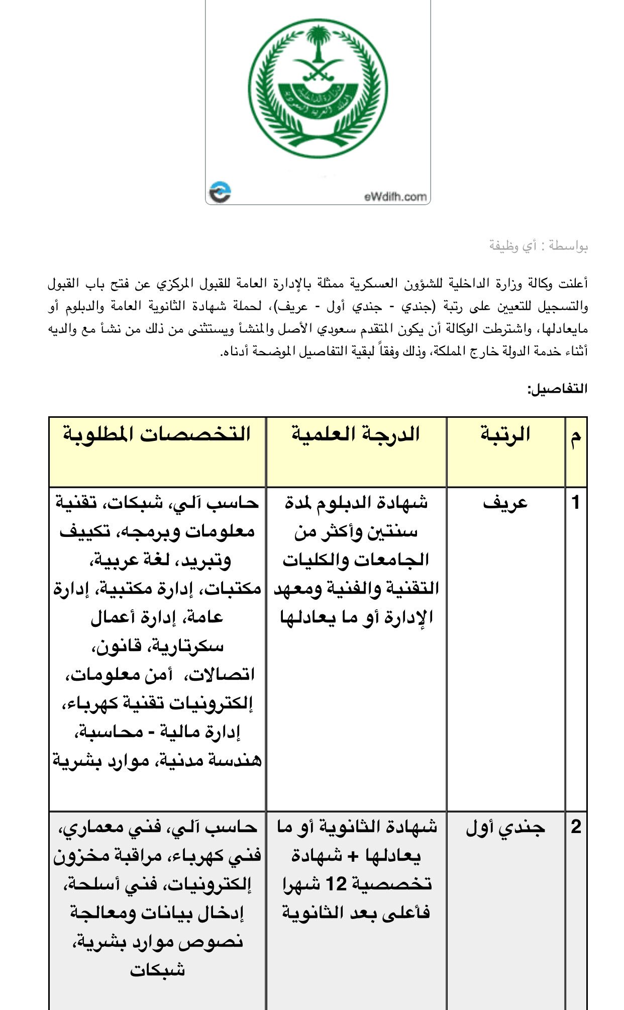 توظيف كوم السعودية On Twitter أعلنت وكالة وزارة الداخلية للشؤون العسكرية ممثلة بالإدارة العامة للقبول المركزي عن فتح باب القبول والتسجيل للتعيين على رتبة جندي جندي أول عريف لحملة شهادة الثانوية العامة والدبلوم أو مايعادلها